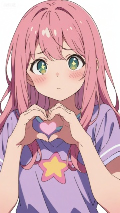 1girl, heart hands, solo, heart, green eyes, blush, white background, looking at viewer, star \(symbol\), simple background, pink hair, upper body, short sleeves, pink hair, shirt, long hair, purple shirt,