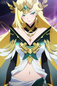 xh,1girl,solo,long hair,blonde hair,hair ornament,green eyes,eyeshadow,jewelry,earrings,breasts,detached collar,elbow gloves,dress,bracelet,navel,midriff, ,,,upper body,cleavage ,