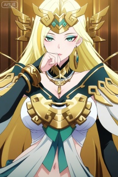 xh,1girl,solo,long hair,blonde hair,hair ornament,green eyes,eyeshadow,jewelry,earrings,breasts,detached collar,elbow gloves,dress,bracelet,navel,midriff, ,,,upper body,cleavage ,groin,bare shoulders,