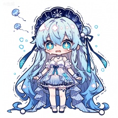 1girl, solo, ice blue jellyfish-like hair, transparent wavy hair, bioluminescent hair tips, light amber jellyfish eyes, glowing pupils, innocent expression, soft gaze, slightly open mouth, pale translucent skin, bioluminescent blue blush, jellyfish humanoid, full body jellyfish transformation, jellyfish tentacle limbs, transparent tentacles with bioluminescent blue stripes, floating tentacles, jellyfish bell-shaped skirt, sheer bioluminescent blue overlay, white camisole, light blue lace trim, ice blue cropped blouse, puff sleeves, white bow, white pearl choker, light blue ribbon wristbands, standing pose, floating posture, ethereal movement, solid white background, no other background elements, bioluminescent glow, transparent texture, delicate line art, soft shading, no watermark, no text, marine fantasy, pure and ethereal aesthetic,chibi