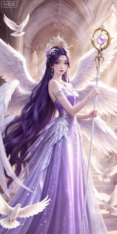 lvjing,1girl,wings,solo,bird,flower,long hair,dress,dove,angel wings,feathered wings,very long hair,holding,white wings,purple dress,rose,staff,multiple wings,animal,4,