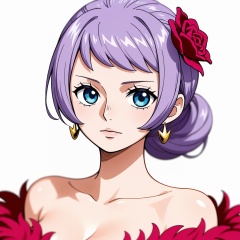 depth of field,masterpiece,best quality,very aesthetic,alternate costume,alternate costume,2024,2023,perfect composition,ultra-detailed,extreme aesthetic,masterpiece,best quality,good quality,newest,year 2024,year 2023,very aesthetic,absurdres,looking_at_viewer,colorful,<lora:卡莉娜:0.6>,Carina one piece,Carina\(one piece\),purple hair,blue eyes,short hair,hair ornament,hair flower,white_background,simple background,looking_at_viewer,bare shoulders,portrait,