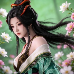 score_9,<lora:牧神记-龙娇男Pony:0.8> 1girl,solo, long hair, black hair, hair ornament, hair bun,necklace, bare shoulders, chinese clothes, breasts, green dress, off shoulder, sash, upper body,from side,flower,