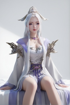 masterpiece,best quality,realistic,cinematic,detail eyes,(ultra-detailed),perfect composition,intricate details,absurdres,detailed face,high quality,high res,8K,<lora:X_mengqianqiu_IL3.0:0.8>,white hair,purple eyes,forehead mark,1girl,long hair,breast,medium breast,hair_ornament,dress,white_dress,bare_legs,sitting,simple background,white_background,bed,looking_at_viewer,