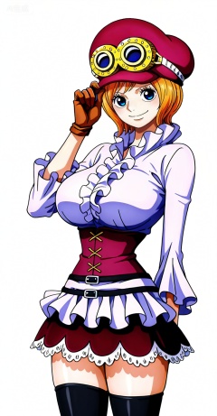 ,Koala one piece,Koala\(one piece\),1girl,solo,thighhighs,hat,breasts,gloves,blue eyes,orange hair,large breasts,goggles,short hair,skirt,goggles on headwear,black thighhighs,smile,depth of field,masterpiece,best quality,very aesthetic,alternate costume,alternate costume,2024,2023,perfect composition,ultra-detailed,extreme aesthetic,masterpiece,best quality,good quality,newest,year 2024,year 2023,very aesthetic,absurdres,looking_at_viewer,colorful,(white_background:1.1),simple background,