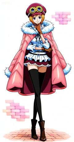 Koala one piece, Koala\(one piece\), solo, 1girl, thighhighs, hat, goggles on headwear, gloves, blue eyes, short hair, black thighhighs, skirt, goggles, zettai ryouiki, blonde hair, boots, crossed legs, full body, smile, brick wall, orange hair, miniskirt, coat, fur trim