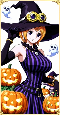 1girl,witch hat,gloves,jewelry,hat,breasts,solo,jack-o'-lantern,dress,halloween,earrings,ghost,black gloves,necklace,looking at viewer,black dress,pumpkin,smile,black headwear,sleeveless,elbow gloves,happy halloween,sleeveless dress,striped dress,bracelet,purple eyes,border,skull,upper body,halloween costume,witch,striped clothes,hand on headwear,large breasts,closed mouth,bare shoulders,
