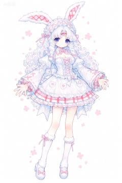 white background, full body monsterization, lop-eared rabbit monster, monster girl, pastel pink curly hair, ice blue eyes, distorted rabbit ears, tattered lolita cloak, plaid pattern, lace headband, corrupted gem decoration, bandaged monster limbs, clawed high heels, broken fabric texture, monochrome horror, ethereal monster, melancholy monster expression, fluffy monster fur, glitched rabbit features, demonic rabbit hybrid, fragile monster aesthetic