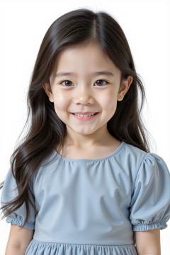 HDR photo of cinematic film still, A 5-year-old female, black long hair, looking at the viewer, smirk, close up. She is wearing a blue boatneck dress, standing in front of a white background.