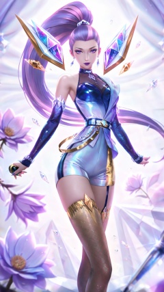 <lora:联盟女团1-000025:0.8>,lvjing,1girl,long hair,purple hair,gloves,solo,purple eyes,multicolored hair,makeup,ponytail,thighhighs,elbow gloves,jewelry,purple lips,breasts,looking at viewer,official alternate costume,earrings,two-tone hair,very long hair,eyeshadow,microphone,flower,belt,lipstick,gem,shorts,floating object,k/da \(league of legends\),high ponytail,depth of field,masterpiece,best quality,very aesthetic,alternate costume,2024,2023,perfect composition,ultra-detailed,extreme aesthetic,masterpiece,best quality,good quality,newest,year 2024,year 2023,very aesthetic,absurdres,looking_at_viewer,colorful,