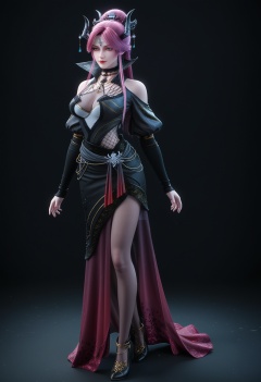 (standing full_body:1.1),score_9,score_8_up,masterpiece,(best quality),intricate details,1girl,facing viewer,(looking at viewer:1.1),<lora:YQ_pony_manluo_V4:0.9:lbw=1,1,1,1,1,1,1,1,1,0.8,0.8,0.1>,q1528437228,1girl,solo,long hair,pink hair,jewelry,horns,hair ornament,earrings,choker,dress,makeup,necklace,red lips,red hair,purple hair,black dress,forehead mark,black high heels,yellow eyes,high collar,black choker,brown eyes,pantyhose,hair bun,black pantyhose,hair over one eye,long sleeves,puffy sleeves,eyeshadow,BREAKscore_9,score_8_up,masterpiece,(best quality),perfect anatomy,(hourglass),perfect face,(simple background,pure black background,black background:1.1),fair_skin,shiny_skin,Ivory_skin,