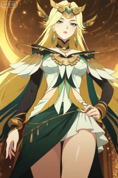 xh,1girl,solo,long hair,blonde hair,hair ornament,green eyes,eyeshadow,jewelry,earrings,breasts,detached collar,elbow gloves,dress,bracelet,skirt,bare legs,feet ornament