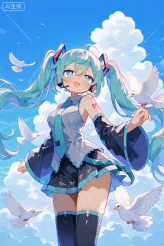 masterpiece, best quality, amazing quality, very aesthetic, absurdres, newest, chromatic aberration, light, subsurface scattering,glowing tattoo,uenomigi,1girl, ahoge, aqua eyes, aqua hair, aqua necktie, aqua trim, arm tattoo, bird, black skirt, blush, boots, breasts, cloud, collared shirt, detached sleeves, dove, floating, floating hair, grey shirt, hair between eyes, hair ornament, headphones, headset, long hair, long sleeves, looking at another, looking up, medium breasts, necktie, number tattoo, open mouth, pleated skirt, shirt, skirt, sleeveless, sleeveless shirt, smile, solo, tattoo, thigh boots, thighhighs, twintails, very long hair, white bird, wide sleeves, yuzukinekoneko, zettai ryouiki, hatsune miku