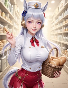 1girl, solo, long hair, breasts, looking at viewer, blush, smile, bangs, skirt, hat, holding, animal ears, purple eyes, tail, white hair, grey hair, cowboy shot, pleated skirt, food, indoors, blunt bangs, grin, neckerchief, buttons, red skirt, white headwear, horse ears, horse girl, red neckerchief, horse tail, basket, bread, shop, chef hat, holding basket, chef, pillbox hat, gold ship \(umamusume\)