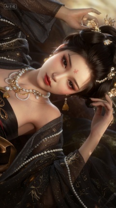3D角色设计,面部特写,倾斜的俯视构图,一位身着华丽古风服饰的亚洲少女侧躺在床上,眼神迷离地凝视着镜头,她化着精致的泪痣妆,身穿带有金色刺绣和珍珠装饰的黑色薄纱长袍,她的头发盘成复杂的发髻,饰有金色的发簪,一只手轻轻抚摸着发髻,柔和的顶光和浅景深效果营造出暧昧的氛围,PBR写实渲染,亚洲少女,俯视构图,浅景深,古风服饰,电影感调色,柔和光影,俯视角,精致妆容,, Negative prompt: ng_deepnegative_v1_75t,(badhandv4:1.2),EasyNegative,(worst quality:2),,nsfw, Steps: 40, Sampler: Euler, CFG scale: 1.0, Seed: 1359309029, Size: 928x1664, Model hash: 98763a1277, Model: Qwen-Image_1.0.safetensors, Denoising strength: 0, RNG: CPU, Lora 1: 【摸鱼】3D, Lora Hash 1: 2106c5bf96, Lora Weight 1: 0.8, Lora 2: 【摸鱼】3D电商渲染级KV海报_创意视觉表达, Lora Hash 2: ce1227b095, Lora Weight 2: 0.4, Lora 3: Qwen-Image-Lightning-8steps-V1.1-bf16.safetensors, Lora Hash 3: fe04c3ec1d, Lora Weight 3: 0.6, vae_name: automatic