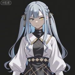 masterpiece, best quality,solo,white background,simple_background,togawa sakiko,cybersaki_style,bangs,ribbon,hair ribbon,black ribbon,two side up,braid,blue hair,grey hair,sidelocks,blunt bangs,heterochromia,yellow eyes,long hair,wavy hair,jewelry,white shirt,puffy sleeves,black skirt,high-waist skirt,black pantyhose,