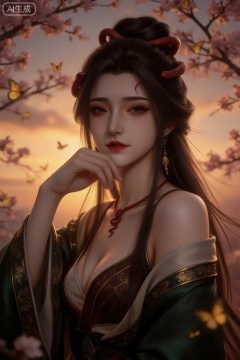 Close-up of an ancient woman, with long black hair in a bun, red snake-shaped hair accessories wrapped around the bun, eyes slightly closed, red eyeshadow at the end of the eyes, dark red lip color, flushed cheeks, red snake-shaped mark on the forehead, fair skin, gold tassel earrings, red snake-shaped necklace (snake head pendant), dark green wide-sleeved gauze Clothes (gold pattern embroidery), inner brown tube top (white trim, deep V-neck), right hand holding chin, elbow support, background is sunset, pink cherry blossom branches, flying yellow-brown and white butterflies, enchanting and gorgeous, classical charm, mysterious, exquisite details, rich layers of light and shadow.