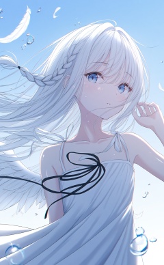masterpiece,highres,absurdres,newest,best quality,loli,petite,high quality,chromatic_aberration,shiny_skin,//,1girl, solo, wings, blue_eyes, long_hair, looking_at_viewer, dress, feathers, bubble, braid, feathered_wings, upper_body, white_dress, ribbon, water_drop, angel_wings, white_hair, black_ribbon, white_wings, sleeveless_dress, sleeveless, floating_hair, bare_shoulders, collarbone, sky, outdoors, blue_sky, hand_up, air_bubble//,<lora:aestivation——【noob】hans:0.8>,