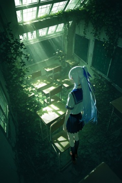 jingliu \(honkai: star rail\),from above,original,1girl,black socks,blouse,brown shoes,chair,chalkboard,classroom,green theme,indoors,ivy,light particles,loafers,lonely,looking afar,overgrown,plant,ponytail,ruins,sad,scenery,school uniform,serafuku,shirt,shoes,short sleeves,skylight,solo,sunlight,white shirt,dark,sola7764,banpai akira,[yoneyama mai,mika pikazo,(quasarcake:0.8),:(onono imoko:0.6),rei \(sanbonzakura\),(cogecha:0.8)],