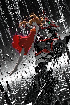 HDR,8K,high contrast,masterpiece,best quality,amazing quality,very aesthetic,superabsurd res,high resolution,ultra-detailed,absurdres,newest,scenery,light rays,chiaroscuro,dynamic angle,score_9,score_8_up,score_7_up,atic aberration,anaglyph,unstable coloring,partially colored,surrounded by floating data streams,fragmented code,dark aura,(ushiki yoshitaka style:0.5),dynamic,from side,foreshortening,souryuu asuka langley in red sundress,((eva 02 in view)),hair flip,wind,twintails,