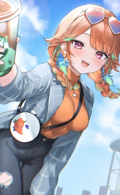 masterpiece,highres,absurdres,newest,best quality,loli,petite,high quality,chromatic_aberration,shiny_skin,//,1girl, virtual_youtuber, takanashi_kiara, jewelry, orange_hair, eyewear_on_head, torn_pants, earrings, jacket, solo, heart-shaped_eyewear, twin_braids, orange_sweater, braid, multicolored_hair, purple_eyes, smile, sweater, heart, pants, open_jacket, looking_at_viewer, denim, sunglasses, breasts, torn_clothes, open_mouth, green_hair, feathers, orange_shirt, long_hair, open_clothes, sky, medium_breasts, official_alternate_costume, tinted_eyewear, cloud, turtleneck, necklace, feather_earrings, strap_between_breasts, long_sleeves, blush, streaked_hair, outdoors, blue_sky, alternate_costume, black_pants, grey_jacket, disposable_cup, bag//,<lora:nekoyashiki_pushio——【noob】hans:1>,