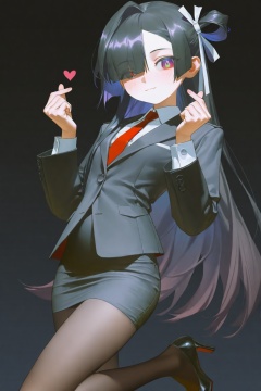 highres,absurdres,very awa,masterpiece,best quality,year 2024,newest,(rei (sanbonzakura):1.2),(potg (piotegu):0.8),(tianliang duohe fangdongye:0.9),(fkey:0.3),(vanripper:0.2),rella,reoen,flat color,\n,black background,1girl,solo,loli,black hair,very long hair,long hair,asymmetric bangs,blunt bangs,diagonal bangs,hair over one eye,eyes visible through hair,single hair intake,single sidelock,single hair ring,red eyes,(gradient eyes:1.6),purple eyes,white pupils,red tie,uniform,black suit,suit jacket,white shirt,black pencil dress,brown pantyhose,black heels,cowboy shot,light blush,light smile,looking at viewer,standing on one leg,finger heart,wink,