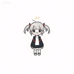 well nano,chibi,upper body, white background,grey hair,1girl, looking at viewer, bangs, skirt, shirt,long sleeves, closed mouth, standing, jacket,open clothes, shoes, teeth, socks, open jacket, two side up, black jacket, sleeves past wrists, backlight