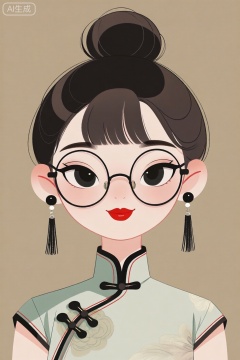 简约卡通风格,丸子头发型,戴着圆框眼镜,红色嘴唇,黑色眼睛,流苏耳环,可爱女孩,旗袍服装,肖像,