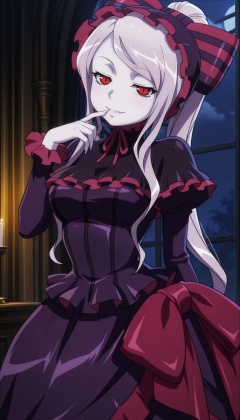 masterpiece, professional artwork,,highres, best quality, perfect face, beautiful face, beautiful eyes, ((perfect female body)), extremely detailed_eyes,beautifully detailed background,looking_at_viewer,cowboy_shot,breasts, 1girl, shalltear, bangs,red eyes, slit pupils, long silver hair,ponytail,colored skin, pale skin,vampire,shallteardress,pink striped purple hair bow,striped hair bow, bonnet,frills,frilled puffy sleeves,purple dress,goth fashion,neck ribbon, night, indoors, seductive smile, finger to mouth,<lora:shalltear:0.9><lora:Smooth_Booster_v2:0.5>