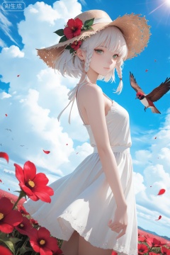 masterpiece,very aware,highres,absurdres,newest,best quality,petite,high quality,chromatic_aberration,cinematic_angle,dutch angle,//,1girl, solo, breasts, looking at viewer, short hair, bangs, hair ornament, hat, dress, bare shoulders, closed mouth, green eyes, standing, braid, flower, white hair, outdoors, sky, alternate costume, day, cloud, hair flower, white dress, from side, blue sky, petals, bird, cloudy sky, red flower, sun hat, straw hat, hat flower, sundress,