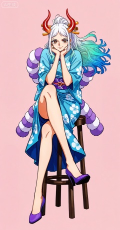 1girl,solo,high heels,sitting,kimono,japanese clothes,crossed legs,sash,purple sash,full body,smile,looking at viewer,hand on own face,floral print,obi,stool,head rest,simple background,legs,purple footwear,cover,jewelry,floating hair,