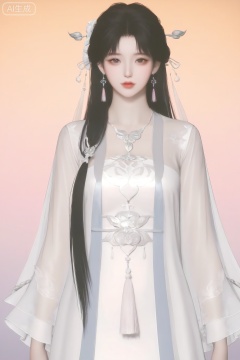 YanYun_style,1girl, solo, long hair, looking at viewer, bangs, black hair, hair ornament, long sleeves, dress, jewelry, earrings, necklace, white dress, see-through, gradient, gradient background, chinese clothes, tassel,