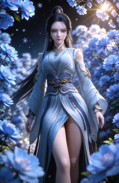 realistic style photo,outstanding style,Use soft lighting to cast gentle shadows on the subject,adding a touch of dimension to your images without compromising details,whirls of vapor,(Anime:1.1),soft neon light,ethereal ambiance,delicate details,magical atmosphere,concept art,highly detailed,ultra-high resolution,32K UHD,sharp focus,best-quality,masterpiece,golden hour,unconventional supreme masterpiece,masterful details,temperate atmosphere,with a high-end texture,in the style of fashion photography,magazine style,Dynamic Angle,Dynamic posture,magazine style,Dynamic Angle,Dynamic posture,(cowboy_shot:1.2),eye trail,depth of field,cinematic lighting,lens flare,close-up,extreme aesthetic,(wlop:0.6),(honjou raita,lack,rella,wanke:0.5),masterpiece,best quality,good quality,newest,year 2025,very aesthetic,absurdres,Visual impact,A shot with tension,ultra-high resolution,32K UHD,sharp focus,best-quality,masterpiece,Emotionalization,unconventional supreme masterpiece,masterful details,temperate atmosphere,with a high-end texture,in the style of fashion photography,(Visual impact:1.2),giving the poster a dynamic and visually striking appearance, <lora:玄界之门-西门雪IL:0.7> 1girl, long hair, black hair, ponytail, hair ornament, earrings, chinese clothes, blue dress, sash, long sleeves, shoulder cutout, stairs, bare legs,high heels,forehead mark, solo,  upper body, blue flower, looking at viewer, snowflakes, closed mouth, branch,