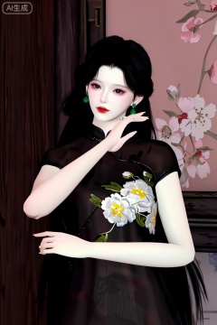 这是一张游戏CGI风格图,描绘了一位年轻女子,皮肤苍白,面孔精致。身材苗条、留着长长的黑色卷发的数字艺术作品。她穿着一件透明的黑色传统中式连衣裙,胸前饰有白色和黄色的花卉刺绣。她的右手轻轻地抚摸着脖子,左手放在臀部上,手指上戴着一枚戒指。她戴着绿色耳环和红色口红,搭配淡粉色眼影。背景左侧是有纹理的深色木板,右侧是粉色花卉图案的墙壁。整体风格写实,略显空灵,精致。