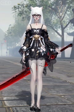 这是一张游戏CGI风格图,描绘了一位年轻女子,皮肤苍白,面孔精致。站在雾气弥漫的街道上,背景是树木。她留着长长的白发和猫耳朵,戴着黑框眼镜,皮肤苍白,腿上有黑色纹身。她穿着一件精致的黑色花卉图案透明和服式服装,带有白色和金色的点缀,露出里面的黑色蕾丝边内衣。她右手握着一把带有黑色装饰的红色发光大剑。她的表情很平静,双腿微微分开,自信地站立着。街道由灰色的石头铺成,雾气缭绕的背景增添了神秘的气氛。