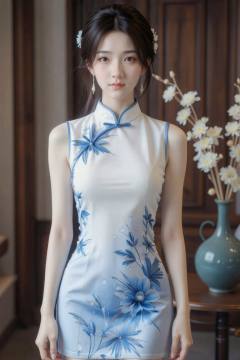Photograph of a young East Asian woman with fair skin and delicate features, standing indoors. She has long, dark brown hair styled in a loose updo with a small flower accessory. She wears a sleeveless, high-collared, traditional Chinese cheongsam dress in white with blue floral embroidery. Her dress is fitted, accentuating her slender physique and small to medium-sized breasts. She has gold, dangling earrings. The background includes a wooden door and a vase with white and yellow flowers on a table to the right. The lighting is soft, highlighting her gentle expression and subtle makeup. The overall style is elegant and traditional., cheongsam, sleeveless cheongsam, sleeveless cheongsam dress, high collar cheongsam, qipao, halter-neck cheongsam dress, <lora:20251228_TinZ-ImageCheongsamLora10:1>