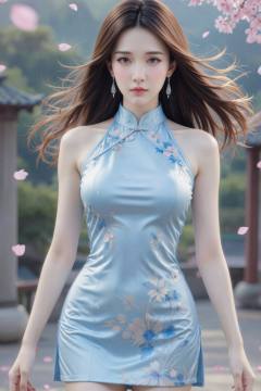 This is a highly detailed, digital CGI portrait of an East Asian woman with long, flowing brown hair and fair skin. She wears a form-fitting, light blue silk halter dress adorned with delicate pink and blue floral embroidery. Her dress has a high neckline and a slight sheen, accentuating her slender, elegant physique. She has large, expressive brown eyes and wears dangling silver earrings. Pink cherry blossom petals float around her, adding a sense of movement. The background features a blurred, traditional Asian garden with green foliage and a wooden structure. The overall image has a soft, realistic style with a slight fantasy element., cheongsam, sleeveless cheongsam, sleeveless cheongsam dress, high collar cheongsam, qipao <lora:20251228_TinZ-ImageCheongsamLora10:1>