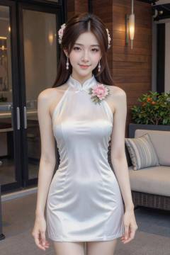 This photograph features a young Asian woman with fair skin and long, straight brown hair adorned with pink and white floral hairpins. She is wearing a shiny, white satin halter dress that accentuates her slim figure and small breasts. A pink and white flower brooch is pinned to the dress's left side. She has pink earrings and is smiling softly. The background includes a wooden-paneled wall, a black-framed glass door, a beige outdoor sofa with a striped pillow, and a potted plant with orange flowers. Warm, modern wall sconces are mounted on the wall. The overall setting suggests a stylish, contemporary outdoor space., cheongsam, sleeveless cheongsam, sleeveless cheongsam dress, high collar cheongsam, qipao, halter-neck cheongsam dress, <lora:20251228_TinZ-ImageCheongsamLora10:1>