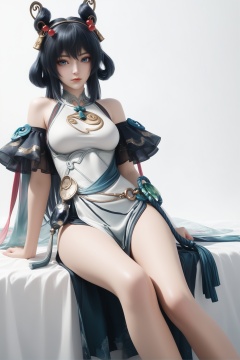 masterpiece,best quality,realistic,cinematic,detail eyes,(ultra-detailed),perfect composition,intricate details,absurdres,detailed face,high quality,high res,8K,<lora:X_gongsunli_lhy_IL3.0:0.8>,black hair,blue eyes,double bun,1girl,long hair,breast,medium breasts,hair_ornament,dress,bare_legs,sitting,simple background,white_background,bed,looking_at_viewer,