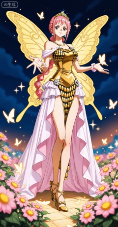 lvjing,1girl,dress,hair ornament,butterfly,jewelry,bug,solo,wings,insect wings,earrings,flower,tiara,necklace,night,butterfly wings,sparkle,outstretched hand,bare shoulders,30,legs,long legs,high_heels,white dress,gold dress,pink dress,