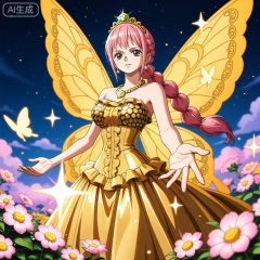 lvjing,1girl,dress,hair ornament,butterfly,jewelry,bug,solo,wings,insect wings,earrings,flower,tiara,necklace,night,butterfly wings,sparkle,outstretched hand,bare shoulders,gold dress,