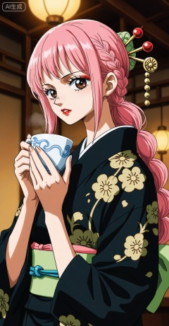 1girl,solo,japanese clothes,kimono,hair ornament,hair stick,black kimono,looking at viewer,makeup,cup,red lips,lipstick,holding,upper body,parted lips,eyelashes,holding cup,indoors,