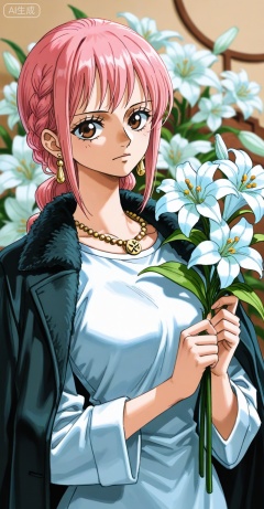 flower,jewelry,earrings,white flower,looking at viewer,lily \(flower\),shirt,upper body,chinese clothes,white shirt,necklace,fur trim,closed mouth,long sleeves,jacket,