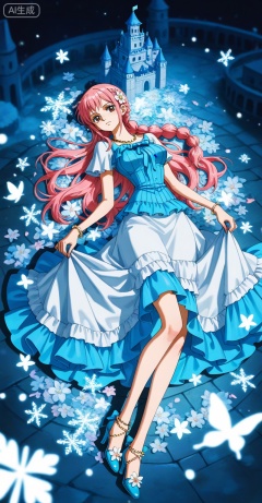 lvjing,1girl,dress,long hair,solo,skirt hold,hair ornament,jewelry,white hair,white dress,blue dress,necklace,full body,night,castle,butterfly,snowflakes,bug,flower,56, lvjing,lying,on back,high_heels,