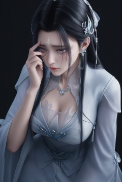 masterpiece,best quality,absurdres,highres,mature female,solo,<lora:新-陆雪琪-ill:0.85>,luxueqi,long hair,black hair,hair ornament,jewelry,earrings,forehead mark,hair bun,hair ribbon,grey_eyes,purple_pupils,(lonely:1.1),sad,BREAKcollarbone,sheer overlay,necklace,dress,belt,see-through cleavage,looking at viewer,(front view),(wiping_tears),cowboy shot,simple background,black background,