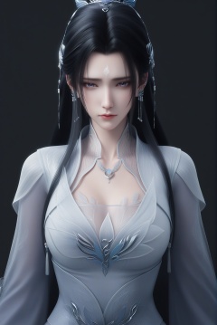 masterpiece,best quality,absurdres,highres,mature female,solo,<lora:新-陆雪琪-ill:0.85>,luxueqi,long hair,black hair,hair ornament,jewelry,earrings,forehead mark,hair bun,hair ribbon,grey_eyes,purple_pupils,(lonely:1.1),sad,BREAKcollarbone,sheer overlay,necklace,dress,belt,cleavage,see-through cleavage,looking at viewer,(front view),cowboy shot,simple background,black background,