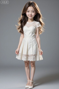 Photograph of a young Asian girl with long, wavy brown hair, standing against a plain gray background. She has a fair complexion and a gentle smile. She is wearing a sleeveless, white lace dress with intricate floral patterns and a lace hem that reaches mid-thigh. The dress has a modest neckline. She is also wearing white high-heeled shoes with ankle straps. Her arms are relaxed by her sides, and she stands with a slight tilt to her right. The lighting is soft, highlighting her delicate features and the texture of the lace dress. The overall style is elegant and whimsical., chibi, chibi young woman