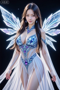 This is a highly detailed, digital CGI artwork of a beautiful Asian woman with long, flowing black hair and fair skin. She is wearing an intricate, revealing outfit made of sheer, white fabric adorned with blue and purple gemstones that cover her large breasts and wrap around her waist. Her outfit is complemented by large, glowing, crystal-like wings that are illuminated with blue and purple light, extending from her back. She has a confident expression and is standing against a black background. Her makeup is subtle, highlighting her delicate features. The overall style is fantasy-themed with a focus on ethereal beauty and magical elements., large glowing crystal wings with a pink and blue hue, sheer white high-waisted skirt, blue and purple crystal-embellished bikini top