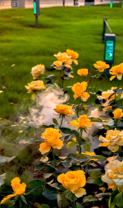 黄昏,草地,黄色的玫瑰花竞相开放,烟雾在花间缭绕,绿色发光指示牌。画面简约干净,光线柔和均匀,营造出宁静、治愈的氛围。采用浅景深拍摄,主体清晰,表现玫瑰丰富的细节。8K画质,艺术摄影,高清细节,高分辨率。