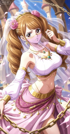 1girl,solo,veil,long hair,chain,mouth veil,jewelry,looking at viewer,necklace,arabian clothes,crop_top,skirt,harem outfit,25,